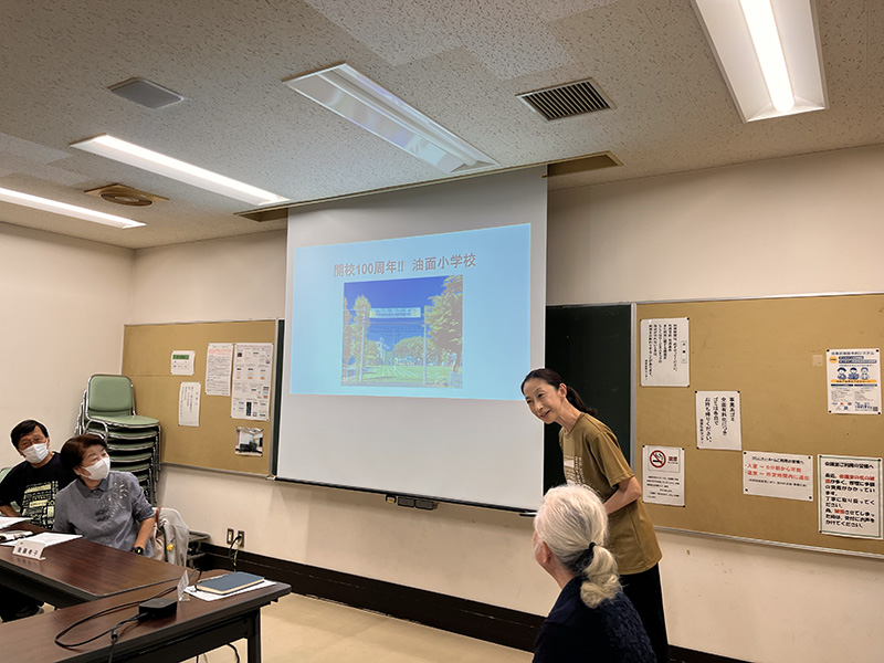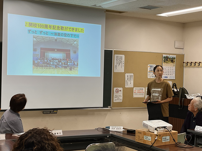 10月の油面住区住民会議定例会において、情報共有のゲストとして、開校100周年を迎える油面小学校の衣非 まさ子校長先生をお迎えし、100周年の取り組みをスライドを用いて紹介いただきました。