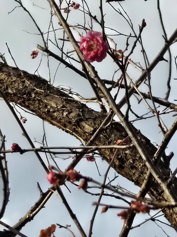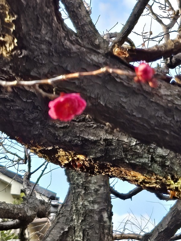 まだ1本の紅梅がほんの少し開きかけています。